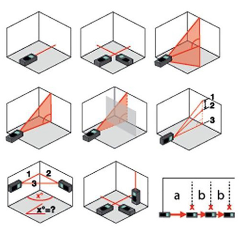 ADA COSMO 100 hat einen eingebauten Neigungsmesser. Diese Funktion wird verwendet, um unzugängliche Werte zu berechnen. Außerdem gibt es einen Modus, um gleiche Entfernungen zu messen.