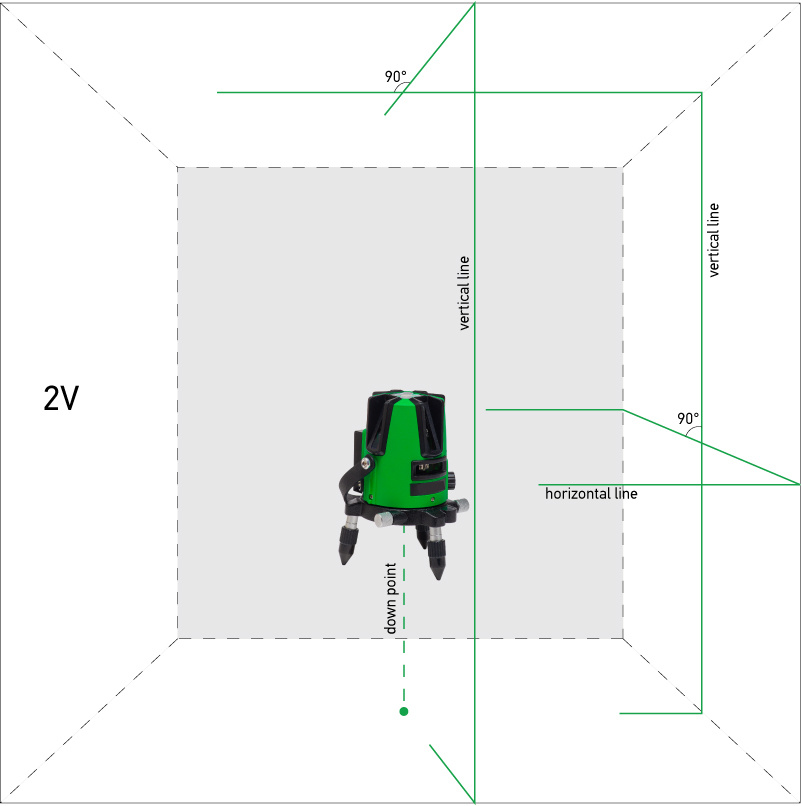 The robust self-levelling cross-line laser has 2 vertical lines (2V), 1 horizontal (H) line and plumb-line down (D)