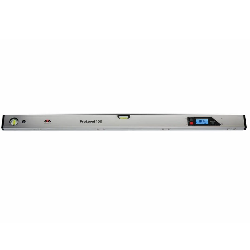 ADA Prolevel 100 Digitaal waterpas met een lengte van 100 cm. De Data op de display kan uitgelezen worden in graden, mm/m, % of in/ft. Met de Hold functie kan de waarde vastgezet worden.